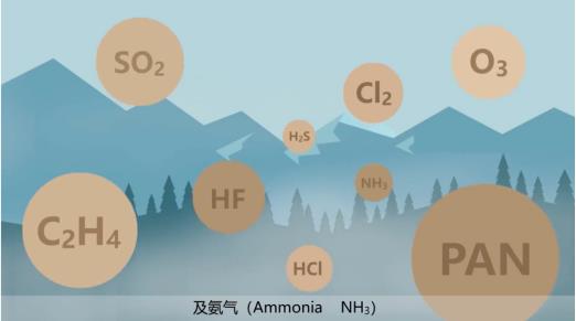 常见的对植物存在较大危害的大气污染物,包括二氧化硫、臭氧、过氧乙酰硝酸酯、氟化氢、乙烯、氯化氢、氯气、硫化氢及氨气。以二氧化硫为例,典型的二氧化硫伤害症状是植物叶片叶脉之间出现伤斑,叶片逐渐呈棕色坏死。